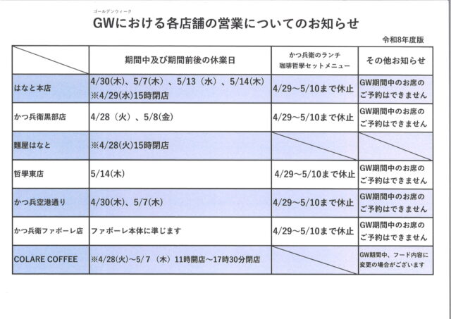 かつ兵衛はなとはなと本店珈琲哲學麺屋はなと GW期間中の営業についてのお知らせ 2026.04.20 平素は弊社各店をご利用いただき、心より感謝申し上げます。 令和8年度のゴールデンウィーク期間中(4/29~5/6)の営業につきまして、お知らせいたします。 お手数ではございますが、ご確認のうえご来店ください。 尚、かつ兵衛ファボーレ店につきましては、館内の営業時間に準じます。 変更がございました場合はご了承ください。